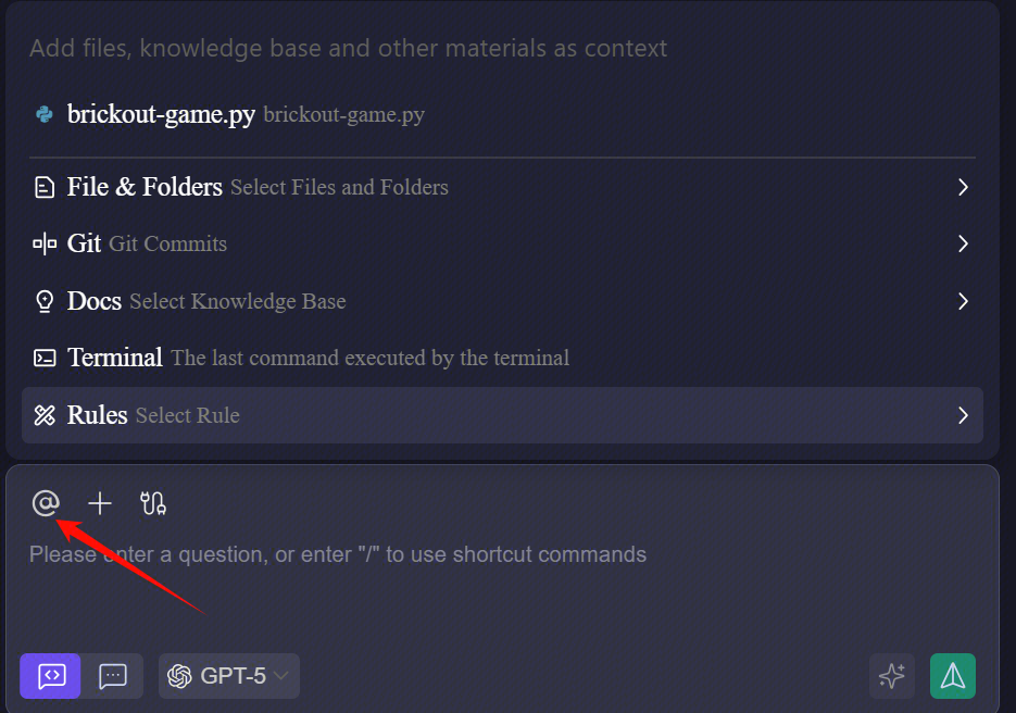 - Context 支持添加 Rules、File & Folder、Git、Terminal、Docs 提供给 AI 模型作为上下文内容