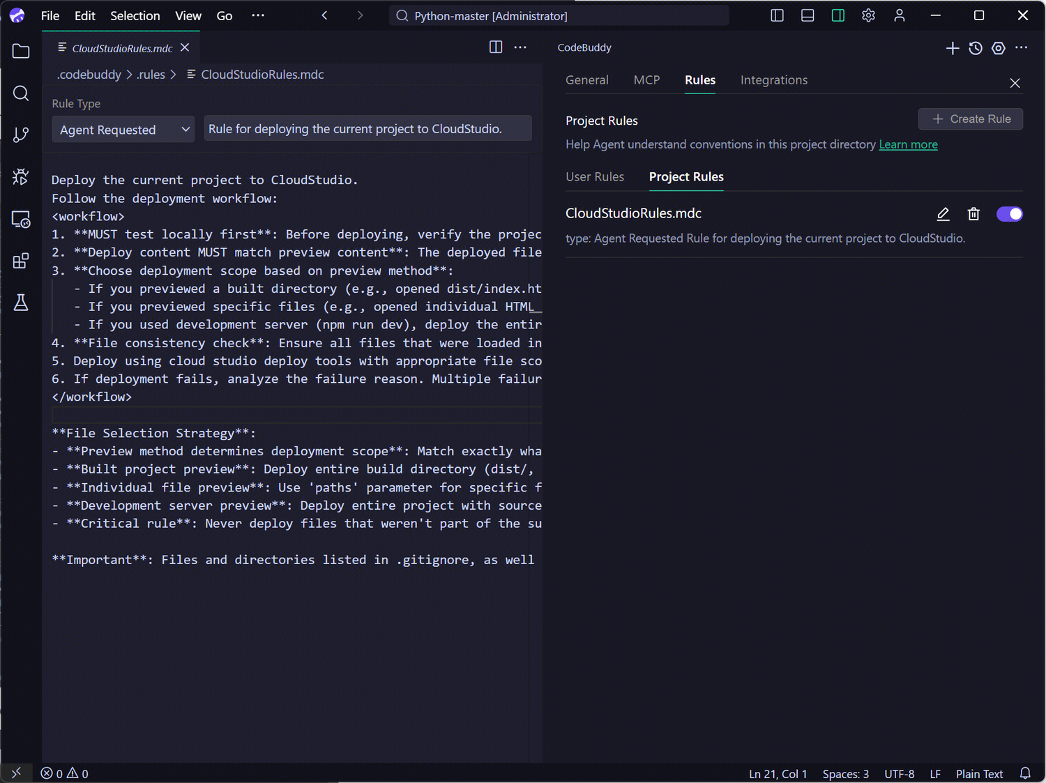 - Rules 为 AI 提供更多的上下文信息,定义 AI 行为,例如可以设定编码规范、框架偏好和项目专属约定等等。
