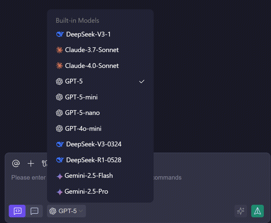 - Models:适配 Claude-3.7-Sonnet、Claude-4.0-Sonnet、GPT-4o-mini、Gemini-2.5-Flash、Gemini-2.5-Pro 多种模型,支持模型之间的切换,提升编码体验。