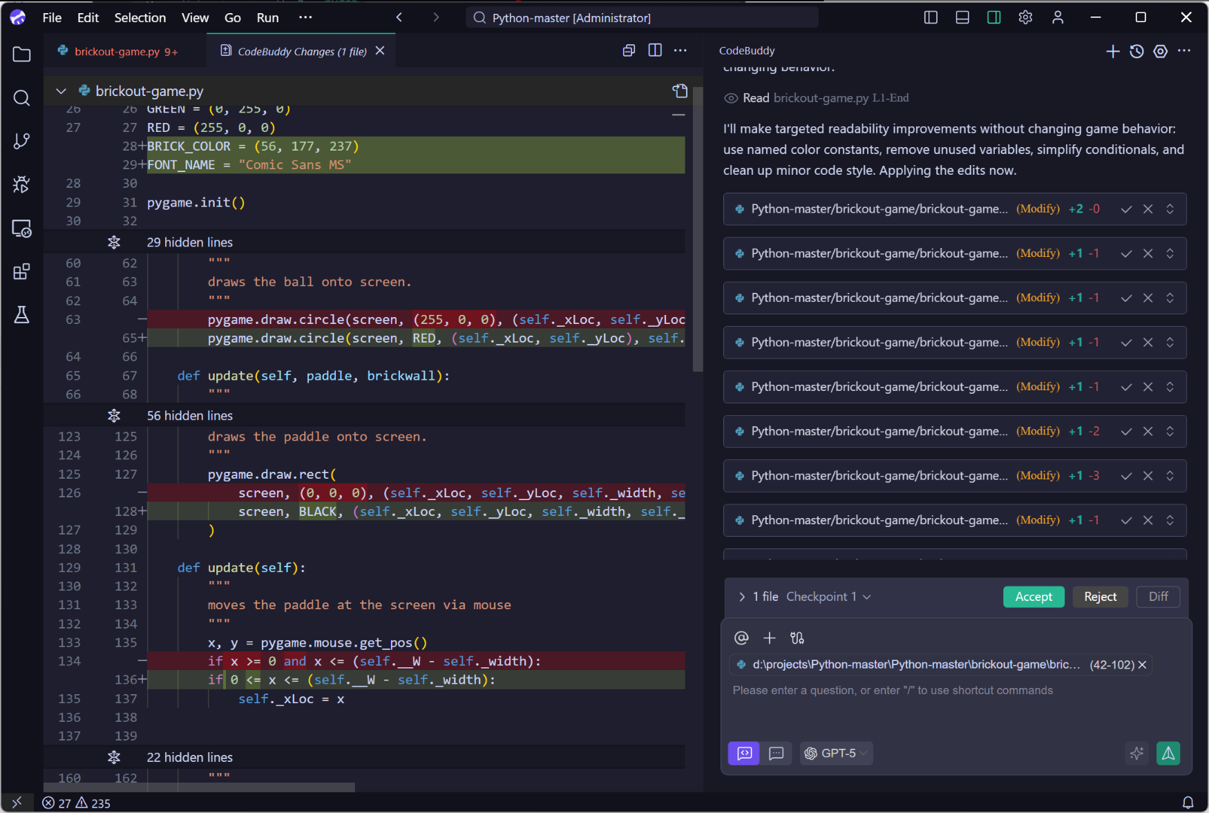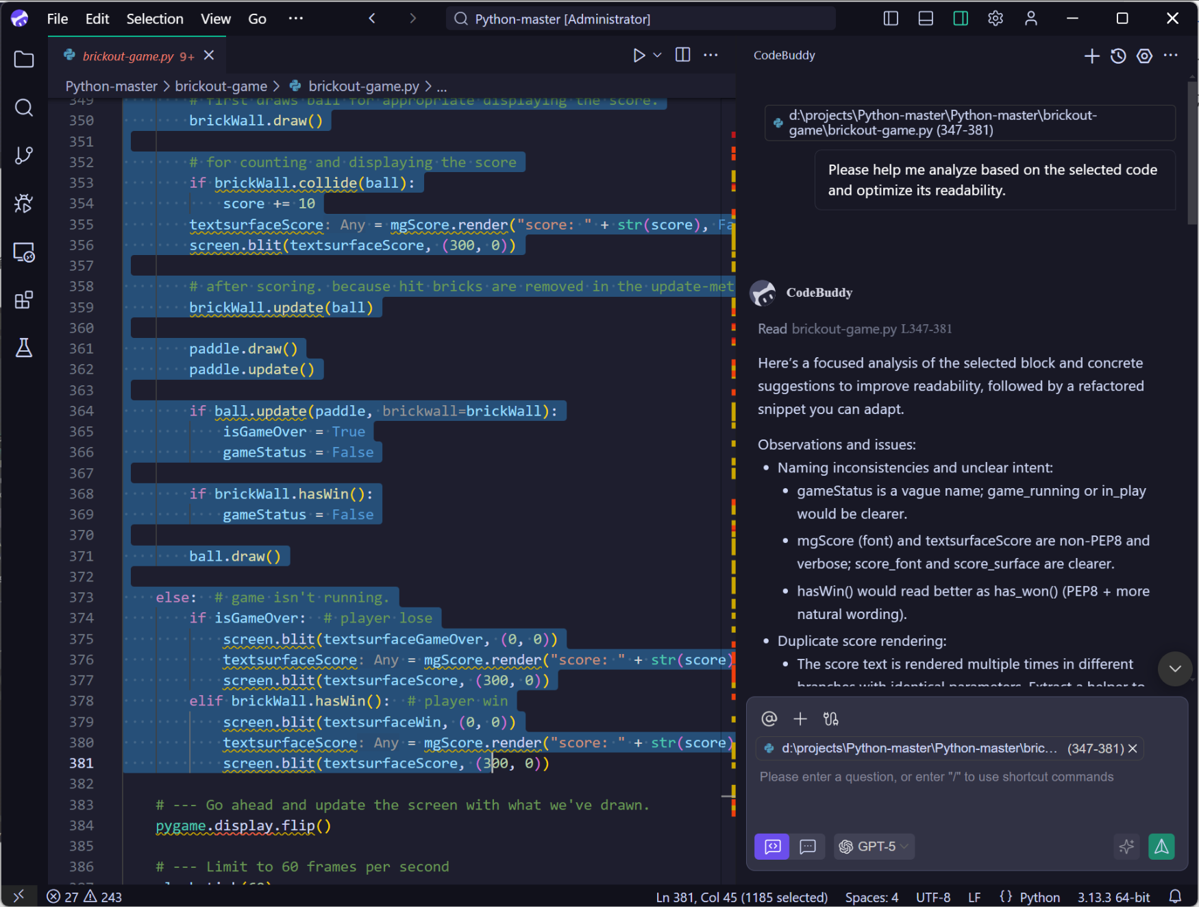 在代码编辑区中,您可以圈选代码片段作为对话上下文,然后在输入框中输入您的任务需求,让 CraftAgent 帮您自动完成任务。如下图所示,您可以看到,Craft Agnet 会先结合代码结构的上下文,分析代码的实现原理,并给出优化建议,根据优化建议直接进行改写文件。