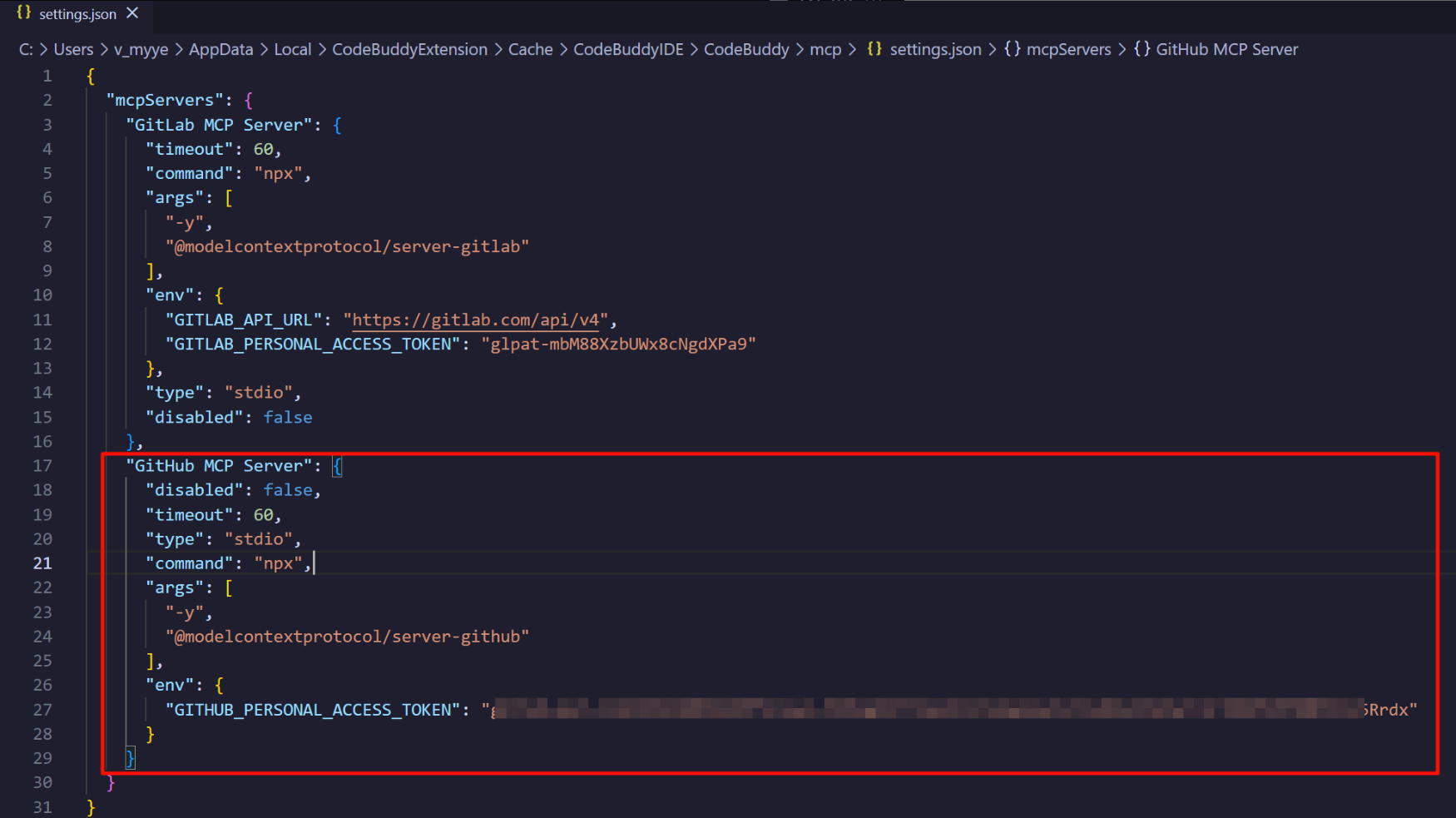 - 在 json 配置文件中增加 MCP Server 的配置信息。以 GitHubMCP Server 为例,如下图: