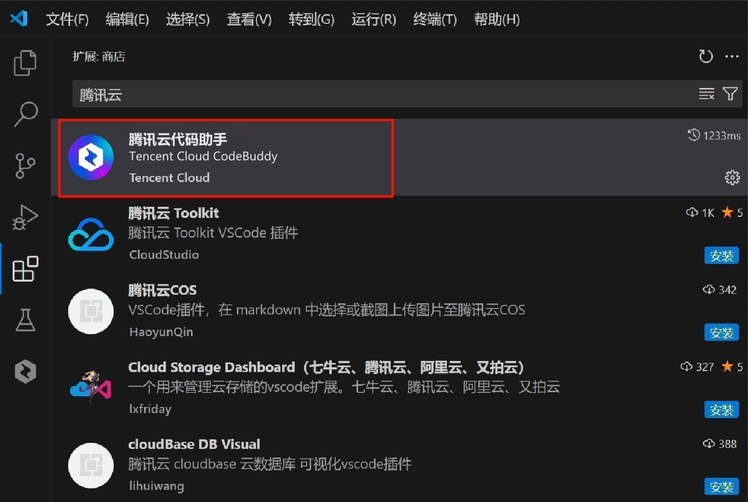 - 安装插件:快速安装:单击一键安装腾讯云代码助手,即可快速跳转到腾讯云代码助手的安装界面。说明:使用快速安装时,请保证已正确安装 Visual Studio Code,否则无法进行一键安装。从 IDE 插件市场安装:您也可以在 VS Code 插件市场手动搜索腾讯云代码助手并下载安装。