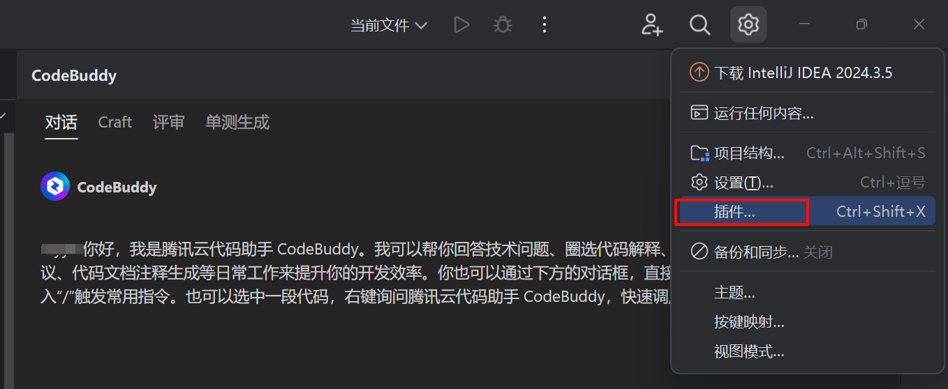 - 安装插件:从 IDE 插件市场安装。 打开插件市场:在右上角的设置中,单击 插件 。