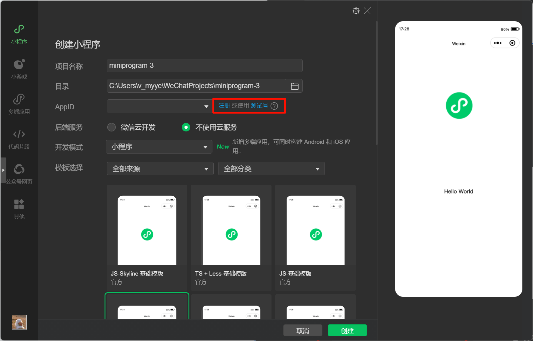 - 如果选择创建项目,则根据您的实际需求进行创建。如果没有 AppID,则可以单击注册按钮进行注册小程序账号;或者直接单击测试号,使用测试号作为AppID,但使用测试号时目前暂不支持选择微信云开发。