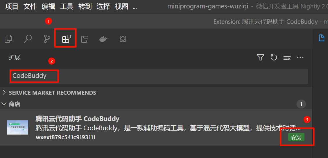 注意:这里所创建的项目属于演示的项目,并非固定,在实际开发项目中需要根据自己的实际情况填写/选择信息,创建属于自己的项目。 - 单击扩展区域图标,展开热门或者在搜索栏中输入腾讯云代码助手 或 CodeBuddy,单击腾讯云代码助手右边的安装,等待安装完成即可。